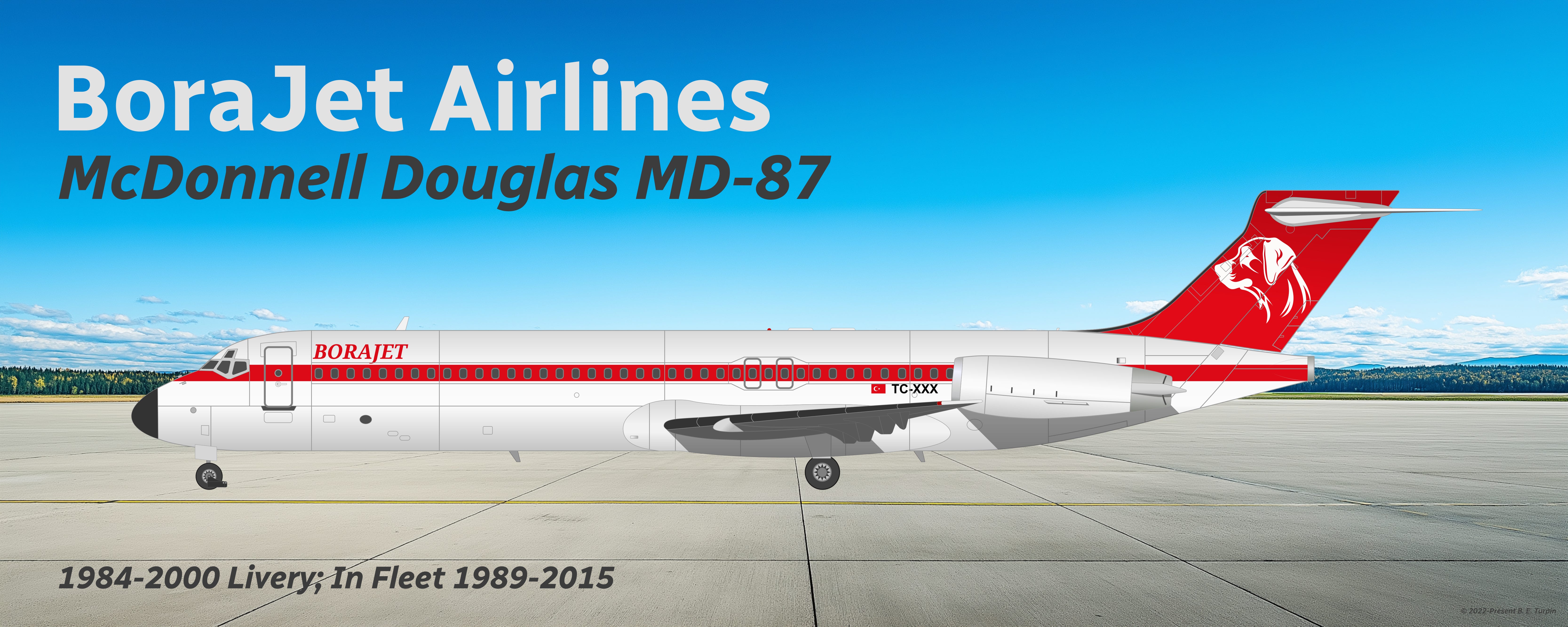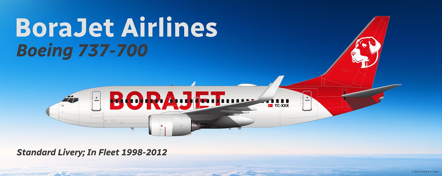 In 2000, BoraJet replaced its original red cheatline livery with an updated tail and fuselage design that displayed the name BORAJET in a bolder billboard style, while also modernizing the appearance of the company’s Kral dog logo to make Kral appear less sad and more dignified.