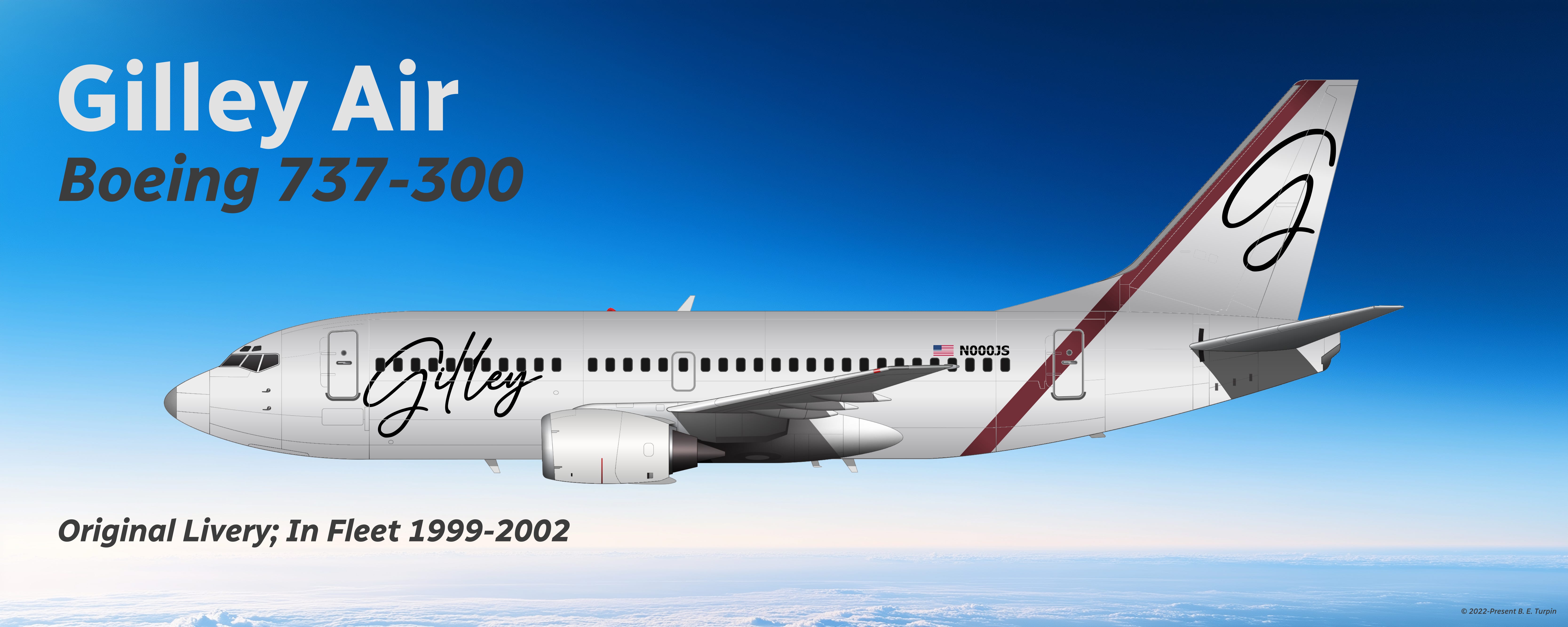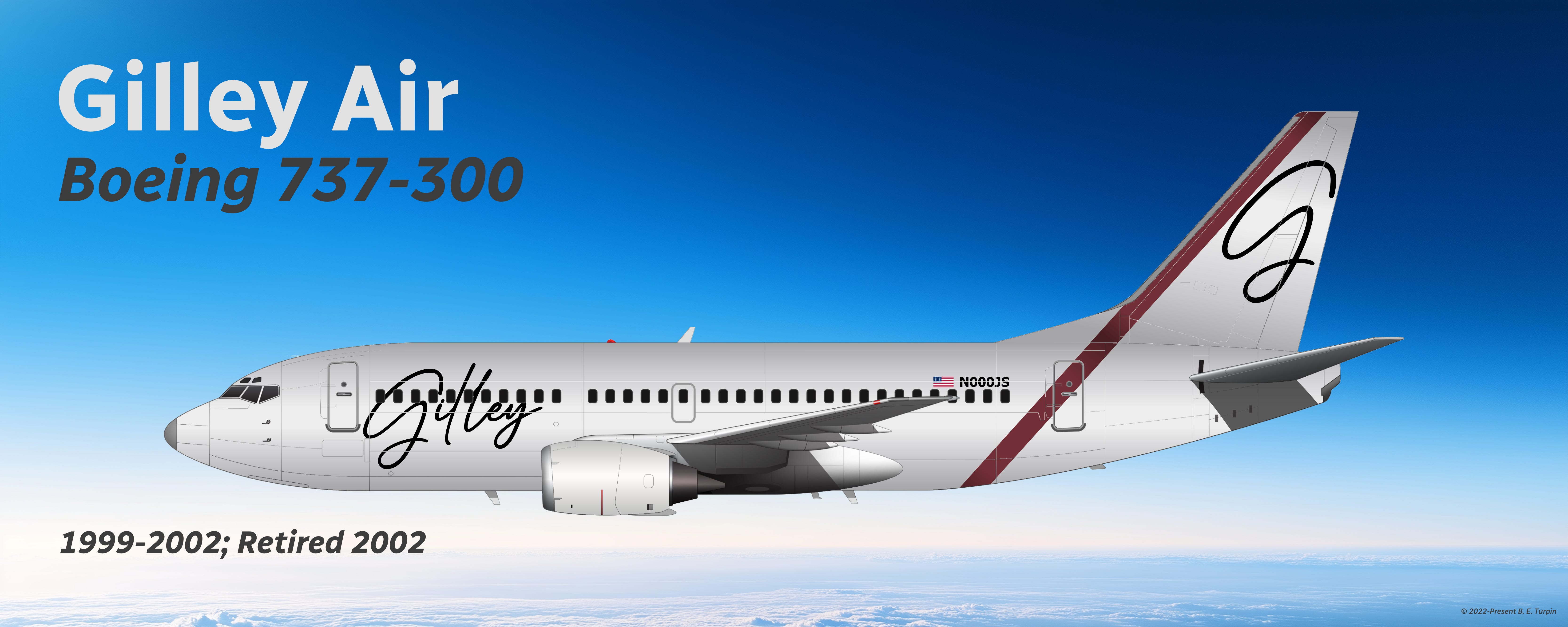 For the livery, each aircraft was repainted in shiny silver, and a wine-colored stripe was placed along the leading edge of the tail that also traced across the back part of the fuselage. The “Gilley” surname part of Jerry Dean Gilley’s autograph was replicated on the front of the fuselage, and the Gilley “G” monogram was reproduced on the tail of the aircraft, to complete the livery design.